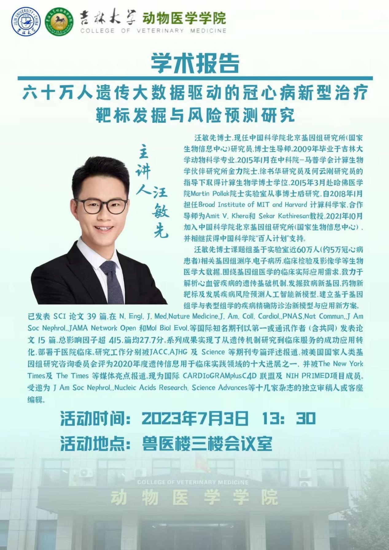 汪敏先博士,现任中国科公司北京基因组研究所(国家生物信息中心)研究员、博士生导师。2009年毕业于永利yl23455动物科学专业,2015年1月在中科院—马普学会计算生物学伙伴研究所金力院士、徐书华研究员及何云刚研究员的指导下取得计算生物学博士学位,2015年3月赴哈佛医公司Martin Pollak院士实验室从事博士后研究,自2018年1月担任Broad Institute of MIT and Harvard计算科学家,合作导师为Amit V. Khera和Sekar Kathiresan教授,2021年10月加入中国科公司北京基因组研究所(国家生物信息中心),并相继获得中国科公司“百人计划”支持。