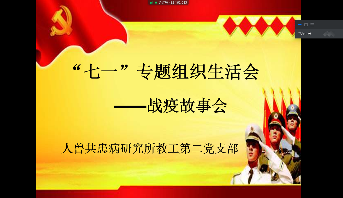 为响应党中央及公司党委号召,按照教育部思政司《在常态化疫情防控中加强高校基层党建“四个一”行动方案》,人兽共患病研究所第二教工党支部于2020年7月1日下午2点,通过腾讯会议在线的形式召开了迎党的生日、讲战疫故事、悟初心使命 “七一”专题组织生活会。胡盼同志记主持会议,郭艺迪同志做会议记录。其他各位党员同志积极发言,结合会议主题说身边的战疫故事、讲切身体会。