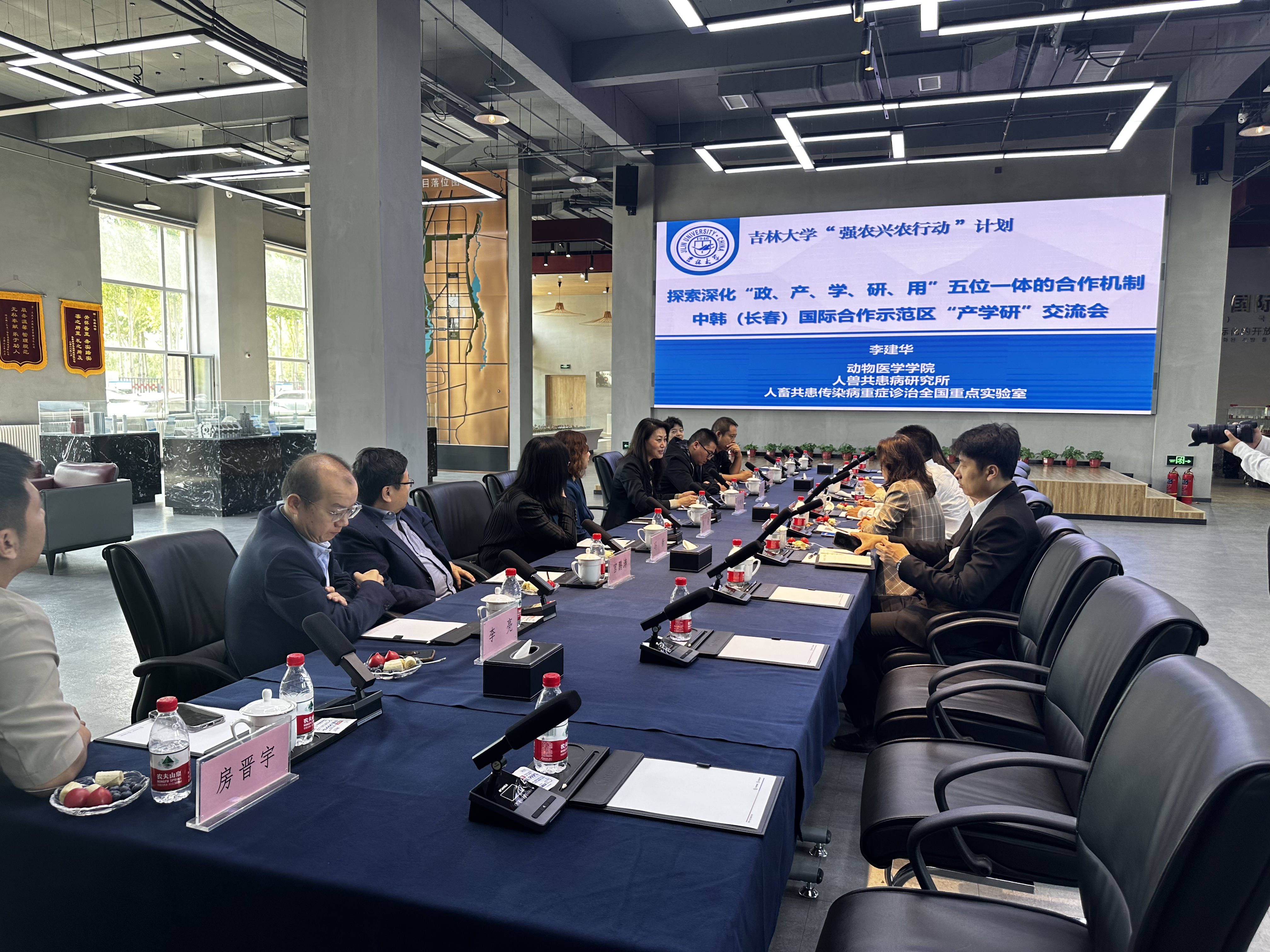 调研团队由公司经理李建华教授领衔,基础兽医系主任王建锋教授、预防兽医系主任冯新教授、农业部岗位科学家宫鹏涛教授、兽药GCP办公室主任邓彦宏副教授,科研办主任李赫副研究员、科研办张茜老师等与会出席。同时,中韩示范区招商一局局长王昕、中韩示范区科技工信局科学技术科负责人郭虹冰、中韩示范区科技工信局李威、北京中民康泰生物科技研究院经理李亮、长盛运营公司副总经理李鹏、长荣集团双创顾问杨志刚参与了此次活动。